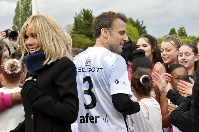 Le président de la République Emmanuel Macron en tenue de footballeur, accompagné de sa femme la Première Dame Brigitte Macron (présidente de la Fondation Hôpitaux de Paris-Hôpitaux de France) lors du match de football caritatif du Variétés club de France au profit de l'opération Pièces jaunes au stade Bernard Giroux à Plaisir, France, le 24 janvier 2024. © Eric Tschaen/Pool/Bestimage French President during the Varietes Club charity football match to benefit children in hospital at the Bernard Giroux stadium, in Plaisir near Paris, France, on April 24, 2024.