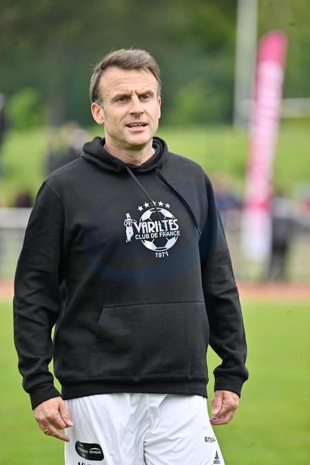 Le président de la République Emmanuel Macron en tenue de footballeur lors du match de football caritatif du Variétés club de France au profit de l'opération Pièces jaunes au stade Bernard Giroux à Plaisir, France, le 24 janvier 2024. © Eric Tschaen/Pool/Bestimage French President during the Varietes Club charity football match to benefit children in hospital at the Bernard Giroux stadium, in Plaisir near Paris, France, on April 24, 2024.