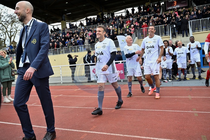 Le président de la République Emmanuel Macron en tenue de footballeur, Didier Deschamps, entraîneur sélectionneur de l'équipe de France de football et Robert Pires lors du match de football caritatif du Variétés club de France au profit de l'opération Pièces jaunes au stade Bernard Giroux à Plaisir, France, le 24 janvier 2024. © Eric Tschaen/Pool/Bestimage French President during the Varietes Club charity football match to benefit children in hospital at the Bernard Giroux stadium, in Plaisir near Paris, France, on April 24, 2024.