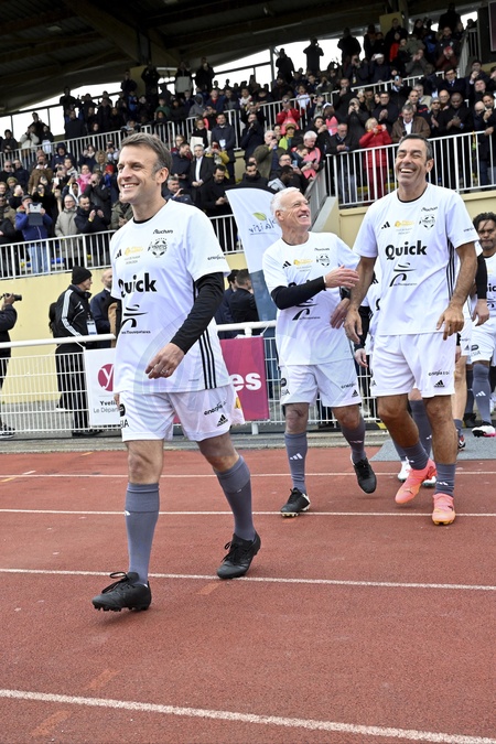 Le président de la République Emmanuel Macron en tenue de footballeur, Didier Deschamps, entraîneur sélectionneur de l'équipe de France de football et Robert Pires lors du match de football caritatif du Variétés club de France au profit de l'opération Pièces jaunes au stade Bernard Giroux à Plaisir, France, le 24 janvier 2024. © Eric Tschaen/Pool/Bestimage French President during the Varietes Club charity football match to benefit children in hospital at the Bernard Giroux stadium, in Plaisir near Paris, France, on April 24, 2024.