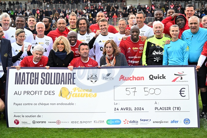 Le président de la République Emmanuel Macron avec Rudi Garcia, Laurent Blanc, Jens Lehmann,Laure Boulleau, Taye Taye, Eden Hazard, Didider Drogba, Fally Ipupa, Johan Neeskens, Mamadou Niang, Marcel Desailly, Arsène Wenger, Christian Karembeu, Didier Deschamps, la Première Dame Brigitte Macron, Karl Olive, Anne Barrère, Jacques Vandroux, Barthélémy Guislain, Thierry Cotillard, Frédéric Levacher, Elie Goracy, Erick Teixera, Chloé Kemmoun, Franck Delhommais, Tayeb Sayah, Antoine Agasse, Laura Cannuto, Vincent Magniez, Yann Ollivier, Alain Giresse lors du match de football caritatif du Variétés club de France au profit de l'opération Pièces jaunes au stade Bernard Giroux à Plaisir, France, le 24 janvier 2024. © Eric Tschaen/Pool/Bestimage French President during the Varietes Club charity football match to benefit children in hospital at the Bernard Giroux stadium, in Plaisir near Paris, France, on April 24, 2024.