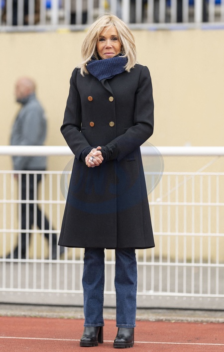 Brigitte Macron - Match de football caritatif du Variétés club de France au profit de l'opération Pièces jaunes au stade Bernard Giroux à Plaisir, France, le 24 janvier 2024. Le match a permis de récolter 57.500€. © Pierre Perusseau/Bestimage French President during the Varietes Club charity football match to benefit children in hospital at the Bernard Giroux stadium, in Plaisir near Paris, France, on April 24, 2024. The match raised €57,500.