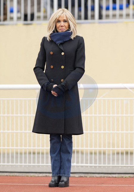 Brigitte Macron - Match de football caritatif du Variétés club de France au profit de l'opération Pièces jaunes au stade Bernard Giroux à Plaisir, France, le 24 janvier 2024. Le match a permis de récolter 57.500€. © Pierre Perusseau/Bestimage French President during the Varietes Club charity football match to benefit children in hospital at the Bernard Giroux stadium, in Plaisir near Paris, France, on April 24, 2024. The match raised €57,500.