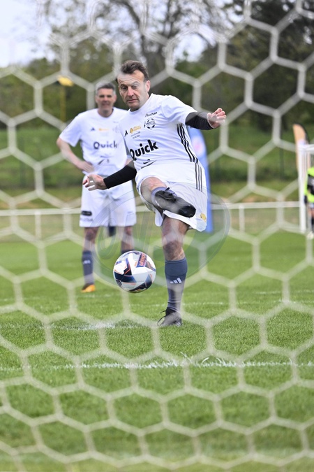 Le président de la République Emmanuel Macron lors du match de football caritatif du Variétés club de France au profit de l'opération Pièces jaunes au stade Bernard Giroux à Plaisir, France, le 24 janvier 2024. © Eric Tschaen/Pool/Bestimage French President during the Varietes Club charity football match to benefit children in hospital at the Bernard Giroux stadium, in Plaisir near Paris, France, on April 24, 2024.