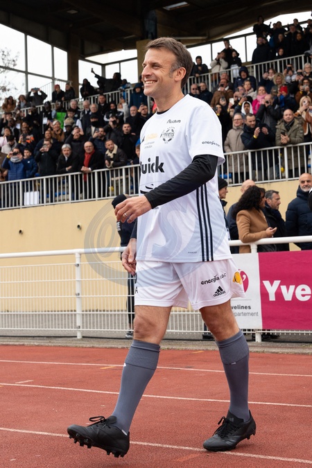 Le président Emmanuel Macron dispute un match de charité avec le Variétés Club de France au profit des Pièces Jaunes à Plaisir