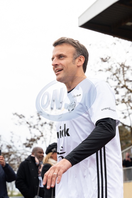 Emmanuel Macron - Match de football caritatif du Variétés club de France au profit de l'opération Pièces jaunes au stade Bernard Giroux à Plaisir, France, le 24 janvier 2024. Le match a permis de récolter 57.500€. © Pierre Perusseau/Bestimage French President during the Varietes Club charity football match to benefit children in hospital at the Bernard Giroux stadium, in Plaisir near Paris, France, on April 24, 2024. The match raised €57,500.