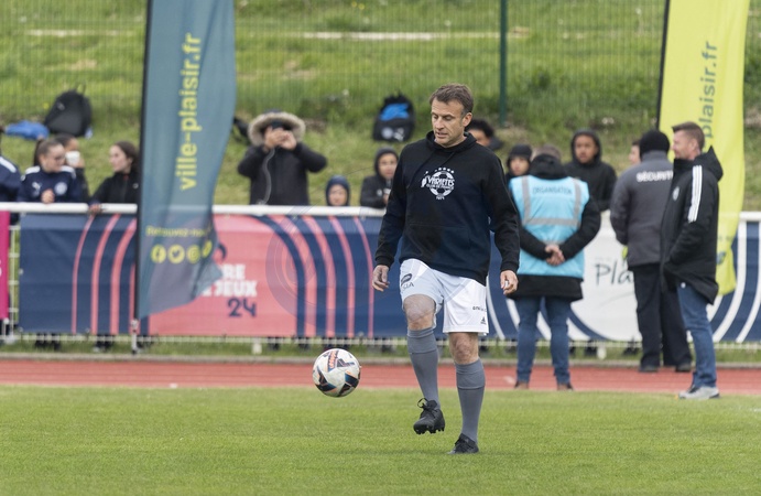 Emmanuel Macron - Match de football caritatif du Variétés club de France au profit de l'opération Pièces jaunes au stade Bernard Giroux à Plaisir, France, le 24 janvier 2024. Le match a permis de récolter 57.500€. © Pierre Perusseau/Bestimage French President during the Varietes Club charity football match to benefit children in hospital at the Bernard Giroux stadium, in Plaisir near Paris, France, on April 24, 2024. The match raised €57,500.