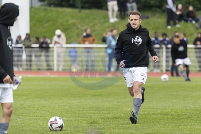 Emmanuel Macron - Match de football caritatif du Variétés club de France au profit de l'opération Pièces jaunes au stade Bernard Giroux à Plaisir, France, le 24 janvier 2024. Le match a permis de récolter 57.500€. © Pierre Perusseau/Bestimage French President during the Varietes Club charity football match to benefit children in hospital at the Bernard Giroux stadium, in Plaisir near Paris, France, on April 24, 2024. The match raised €57,500.