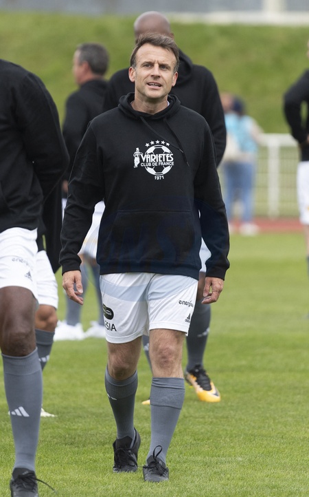Le président Emmanuel Macron dispute un match de charité avec le Variétés Club de France au profit des Pièces Jaunes à Plaisir