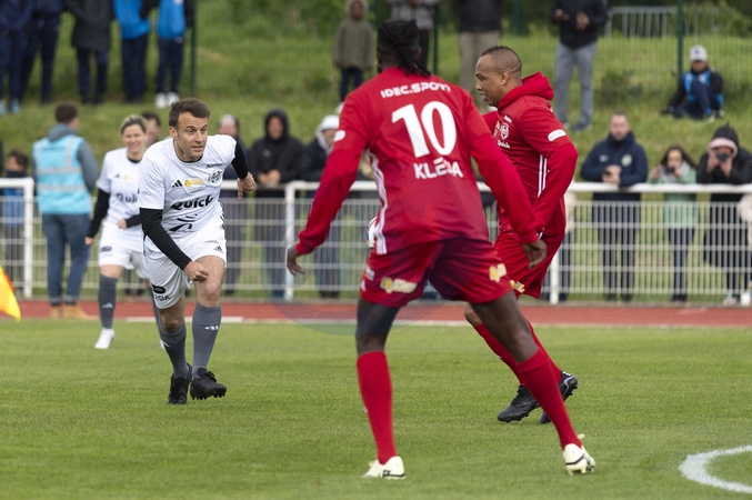 Le président Emmanuel Macron dispute un match de charité avec le Variétés Club de France au profit des Pièces Jaunes à Plaisir