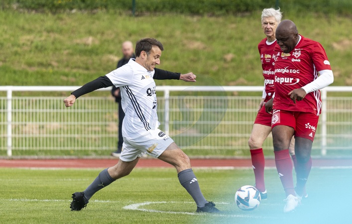 Le président Emmanuel Macron dispute un match de charité avec le Variétés Club de France au profit des Pièces Jaunes à Plaisir
