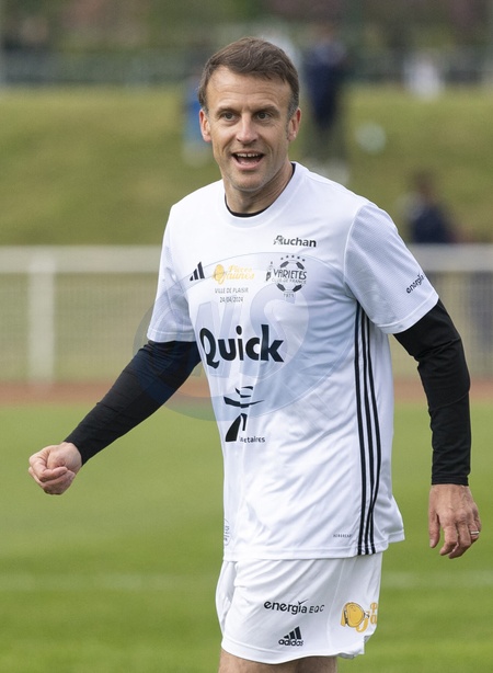 Emmanuel Macron - Match de football caritatif du Variétés club de France au profit de l'opération Pièces jaunes au stade Bernard Giroux à Plaisir, France, le 24 janvier 2024. Le match a permis de récolter 57.500€. © Pierre Perusseau/Bestimage French President during the Varietes Club charity football match to benefit children in hospital at the Bernard Giroux stadium, in Plaisir near Paris, France, on April 24, 2024. The match raised €57,500.