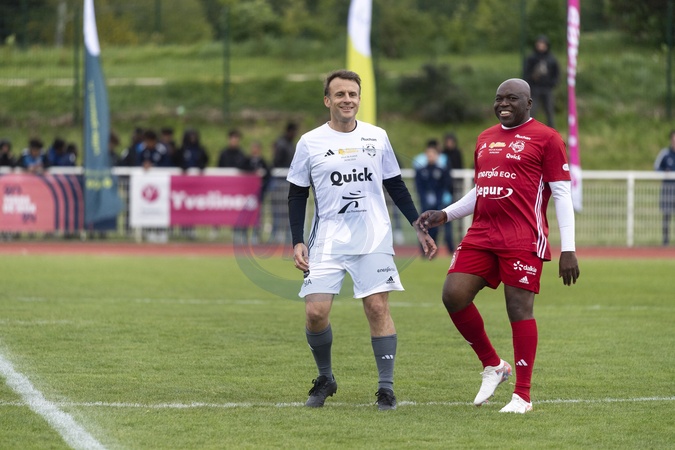 Le président Emmanuel Macron dispute un match de charité avec le Variétés Club de France au profit des Pièces Jaunes à Plaisir