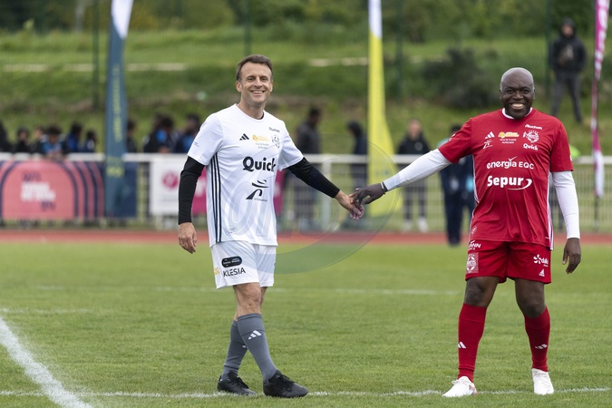 Le président Emmanuel Macron dispute un match de charité avec le Variétés Club de France au profit des Pièces Jaunes à Plaisir