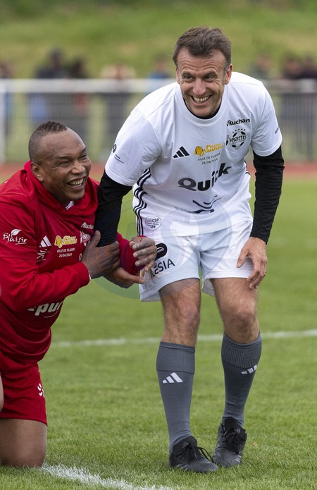 Le président Emmanuel Macron dispute un match de charité avec le Variétés Club de France au profit des Pièces Jaunes à Plaisir