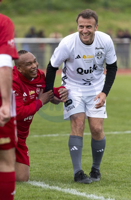 El-Hadji Diouf et Emmanuel Macron - Match de football caritatif du Variétés club de France au profit de l'opération Pièces jaunes au stade Bernard Giroux à Plaisir, France, le 24 janvier 2024. Le match a permis de récolter 57.500€. © Pierre Perusseau/Bestimage French President during the Varietes Club charity football match to benefit children in hospital at the Bernard Giroux stadium, in Plaisir near Paris, France, on April 24, 2024. The match raised €57,500.