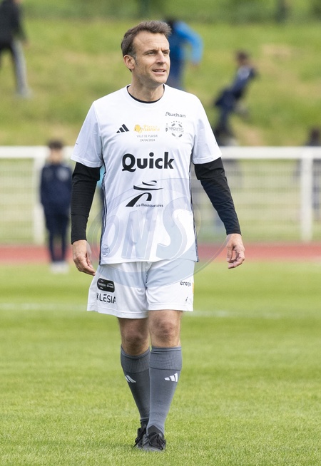 Emmanuel Macron - Match de football caritatif du Variétés club de France au profit de l'opération Pièces jaunes au stade Bernard Giroux à Plaisir, France, le 24 janvier 2024. Le match a permis de récolter 57.500€. © Pierre Perusseau/Bestimage French President during the Varietes Club charity football match to benefit children in hospital at the Bernard Giroux stadium, in Plaisir near Paris, France, on April 24, 2024. The match raised €57,500.