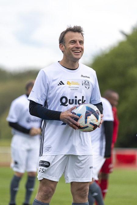 Emmanuel Macron - Match de football caritatif du Variétés club de France au profit de l'opération Pièces jaunes au stade Bernard Giroux à Plaisir, France, le 24 janvier 2024. Le match a permis de récolter 57.500€. © Pierre Perusseau/Bestimage French President during the Varietes Club charity football match to benefit children in hospital at the Bernard Giroux stadium, in Plaisir near Paris, France, on April 24, 2024. The match raised €57,500.