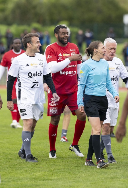 Le président Emmanuel Macron dispute un match de charité avec le Variétés Club de France au profit des Pièces Jaunes à Plaisir