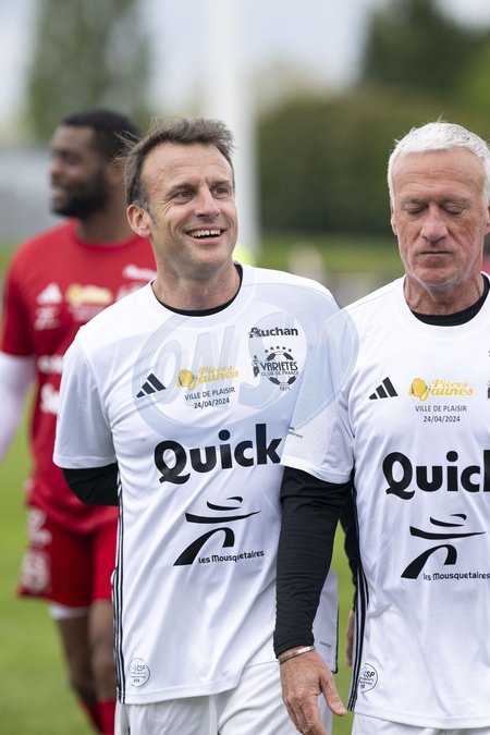 Emmanuel Macron, Didier Deschamps - Match de football caritatif du Variétés club de France au profit de l'opération Pièces jaunes au stade Bernard Giroux à Plaisir, France, le 24 janvier 2024. Le match a permis de récolter 57.500€. © Pierre Perusseau/Bestimage French President during the Varietes Club charity football match to benefit children in hospital at the Bernard Giroux stadium, in Plaisir near Paris, France, on April 24, 2024. The match raised €57,500.