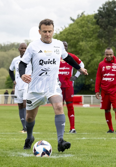 Le président Emmanuel Macron dispute un match de charité avec le Variétés Club de France au profit des Pièces Jaunes à Plaisir