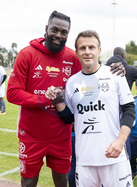 Emmanuel Adebayor et Emmanuel Macron - Match de football caritatif du Variétés club de France au profit de l'opération Pièces jaunes au stade Bernard Giroux à Plaisir, France, le 24 janvier 2024. Le match a permis de récolter 57.500€. © Pierre Perusseau/Bestimage French President during the Varietes Club charity football match to benefit children in hospital at the Bernard Giroux stadium, in Plaisir near Paris, France, on April 24, 2024. The match raised €57,500.