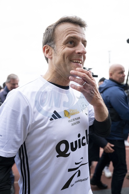Emmanuel Macron - Match de football caritatif du Variétés club de France au profit de l'opération Pièces jaunes au stade Bernard Giroux à Plaisir, France, le 24 janvier 2024. Le match a permis de récolter 57.500€. © Pierre Perusseau/Bestimage French President during the Varietes Club charity football match to benefit children in hospital at the Bernard Giroux stadium, in Plaisir near Paris, France, on April 24, 2024. The match raised €57,500.