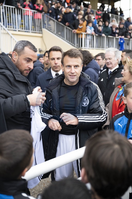 Emmanuel Macron offre son maillot dédicacé - Match de football caritatif du Variétés club de France au profit de l'opération Pièces jaunes au stade Bernard Giroux à Plaisir, France, le 24 janvier 2024. Le match a permis de récolter 57.500€. © Pierre Perusseau/Bestimage French President during the Varietes Club charity football match to benefit children in hospital at the Bernard Giroux stadium, in Plaisir near Paris, France, on April 24, 2024. The match raised €57,500.
