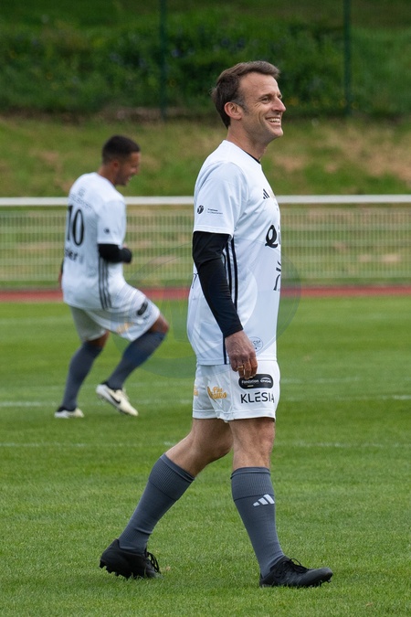 Le président Emmanuel Macron dispute un match de charité avec le Variétés Club de France au profit des Pièces Jaunes à Plaisir