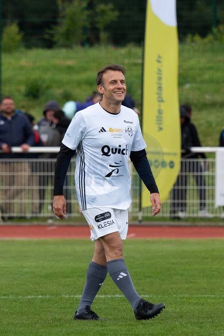 Le président Emmanuel Macron dispute un match de charité avec le Variétés Club de France au profit des Pièces Jaunes à Plaisir