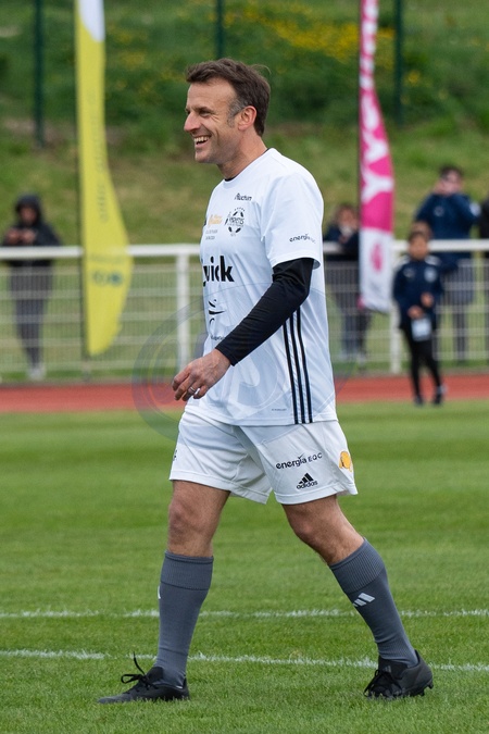 Le président Emmanuel Macron dispute un match de charité avec le Variétés Club de France au profit des Pièces Jaunes à Plaisir