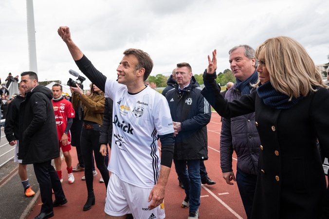 Emmanuel Macron, président de la Republique et sa femme Brigitte lors du match de football caritatif du Variétés club de France au profit de l'opération Pièces jaunes au stade Bernard Giroux à Plaisir, France, le 24 janvier 2024. © Eric Tschaen/Pool/Bestimage French President during the Varietes Club charity football match to benefit children in hospital at the Bernard Giroux stadium, in Plaisir near Paris, France, on April 24, 2024.