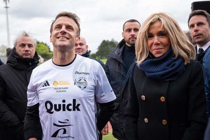 Emmanuel Macron, président de la Republique et sa femme Brigitte lors du match de football caritatif du Variétés club de France au profit de l'opération Pièces jaunes au stade Bernard Giroux à Plaisir, France, le 24 janvier 2024. © Eric Tschaen/Pool/Bestimage French President during the Varietes Club charity football match to benefit children in hospital at the Bernard Giroux stadium, in Plaisir near Paris, France, on April 24, 2024.