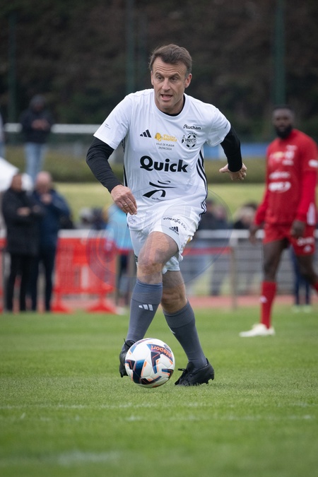 Emmanuel Macron, président de la Republique lors du match de football caritatif du Variétés club de France au profit de l'opération Pièces jaunes au stade Bernard Giroux à Plaisir, France, le 24 janvier 2024. © Eric Tschaen/Pool/Bestimage French President during the Varietes Club charity football match to benefit children in hospital at the Bernard Giroux stadium, in Plaisir near Paris, France, on April 24, 2024.