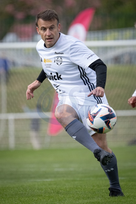 Emmanuel Macron, président de la Republique lors du match de football caritatif du Variétés club de France au profit de l'opération Pièces jaunes au stade Bernard Giroux à Plaisir, France, le 24 janvier 2024. © Eric Tschaen/Pool/Bestimage French President during the Varietes Club charity football match to benefit children in hospital at the Bernard Giroux stadium, in Plaisir near Paris, France, on April 24, 2024.
