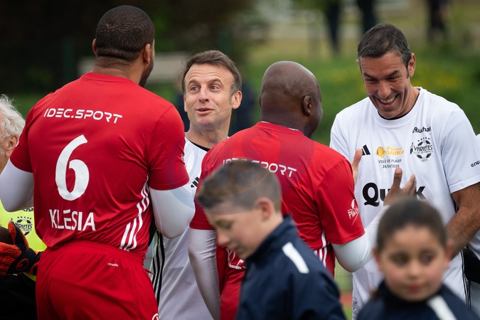 Emmanuel Macron, président de la Republique et Robert Pires lors du match de football caritatif du Variétés club de France au profit de l'opération Pièces jaunes au stade Bernard Giroux à Plaisir, France, le 24 janvier 2024. © Eric Tschaen/Pool/Bestimage French President during the Varietes Club charity football match to benefit children in hospital at the Bernard Giroux stadium, in Plaisir near Paris, France, on April 24, 2024.