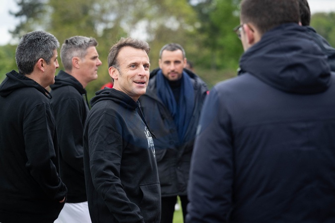 Emmanuel Macron, président de la Republique lors du match de football caritatif du Variétés club de France au profit de l'opération Pièces jaunes au stade Bernard Giroux à Plaisir, France, le 24 janvier 2024. © Eric Tschaen/Pool/Bestimage French President during the Varietes Club charity football match to benefit children in hospital at the Bernard Giroux stadium, in Plaisir near Paris, France, on April 24, 2024.