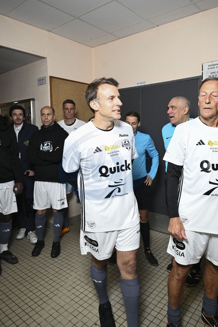 Exclusif - No Web - Emmanuel Macron - Match de football caritatif du Variétés club de France au profit de l'opération Pièces jaunes au stade Bernard Giroux à Plaisir, France, le 24 janvier 2024. Le match a permis de récolter 57.500€. © Pierre Perusseau/Bestimage Exclusive - No Web - For Germany call for price - French President during the Varietes Club charity football match to benefit children in hospital at the Bernard Giroux stadium, in Plaisir near Paris, France, on April 24, 2024. The match raised €57,500. No Web For Belgium and Switzerland