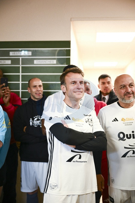 Exclusif - No Web - Emmanuel Macron - Match de football caritatif du Variétés club de France au profit de l'opération Pièces jaunes au stade Bernard Giroux à Plaisir, France, le 24 janvier 2024. Le match a permis de récolter 57.500€. © Pierre Perusseau/Bestimage Exclusive - No Web - For Germany call for price - French President during the Varietes Club charity football match to benefit children in hospital at the Bernard Giroux stadium, in Plaisir near Paris, France, on April 24, 2024. The match raised €57,500. No Web For Belgium and Switzerland