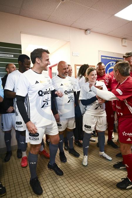 Exclusif - No Web - Emmanuel Macron - Match de football caritatif du Variétés club de France au profit de l'opération Pièces jaunes au stade Bernard Giroux à Plaisir, France, le 24 janvier 2024. Le match a permis de récolter 57.500€. © Pierre Perusseau/Bestimage Exclusive - No Web - For Germany call for price - French President during the Varietes Club charity football match to benefit children in hospital at the Bernard Giroux stadium, in Plaisir near Paris, France, on April 24, 2024. The match raised €57,500. No Web For Belgium and Switzerland