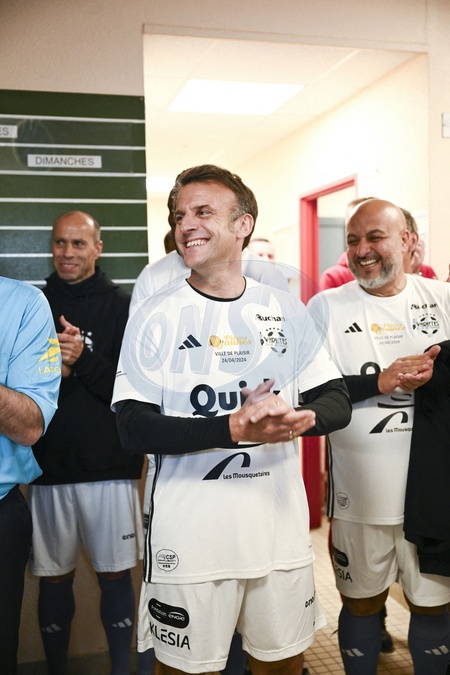 Exclusif - No Web - Emmanuel Macron - Match de football caritatif du Variétés club de France au profit de l'opération Pièces jaunes au stade Bernard Giroux à Plaisir, France, le 24 janvier 2024. Le match a permis de récolter 57.500€. © Pierre Perusseau/Bestimage Exclusive - No Web - For Germany call for price - French President during the Varietes Club charity football match to benefit children in hospital at the Bernard Giroux stadium, in Plaisir near Paris, France, on April 24, 2024. The match raised €57,500. No Web For Belgium and Switzerland