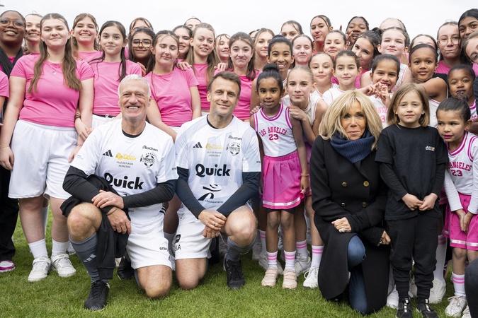 Exclusif - No Web - Didier Deschamps, Emmanuel Macron et Brigitte Macron - Match de football caritatif du Variétés club de France au profit de l'opération Pièces jaunes au stade Bernard Giroux à Plaisir, France, le 24 janvier 2024. Le match a permis de récolter 57.500€. © Pierre Perusseau/Bestimage Exclusive - No Web - For Germany call for price - French President during the Varietes Club charity football match to benefit children in hospital at the Bernard Giroux stadium, in Plaisir near Paris, France, on April 24, 2024. The match raised €57,500. No Web For Belgium and Switzerland