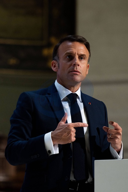 Le président de la République française Emmanuel Macron prononce un discours sur l'Europe depuis l'université de la Sorbonne à Paris, France, le 25 avril 2024. © Jeanne Accorsini/Pool/Bestimage Speech of Emmanuel Macron, President of the French Republic on Europe at La Sorbonne. La Sorbonne University, Paris, France. Wednesday 24th April 2024.