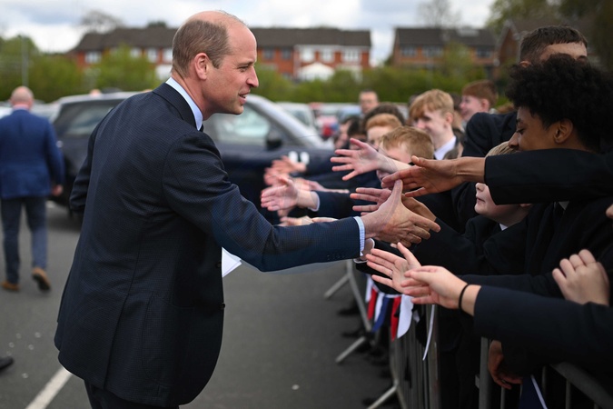 Britain's Prince William, Prince of Wales, shakes hands with schoolchildren as he leaves, after his visit to St. Michael's Church of England High School in Rowley Regis, central England on April 25, 2024. During his visit Britain's Prince William, Prince of Wales will learn about the award-winning student-led initiatives available to pupils to support their mental health and wellbeing., Credit:OLI SCARFF / Avalon