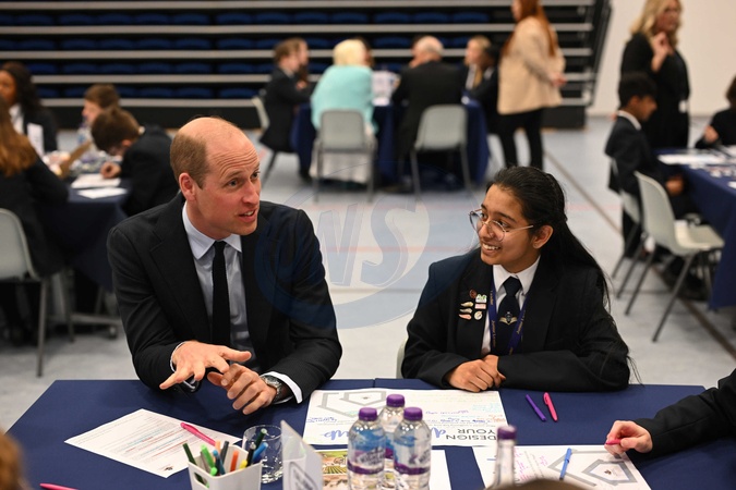 Britain's Prince William, Prince of Wales (L) speaks with students using the "Talking Tables" initiative, during a visit to St. Michael's Church of England High School in Rowley Regis, central England on April 25, 2024. During his visit Britain's Prince William, Prince of Wales will learn about the award-winning student-led initiatives available to pupils to support their mental health and wellbeing., Credit:OLI SCARFF / Avalon