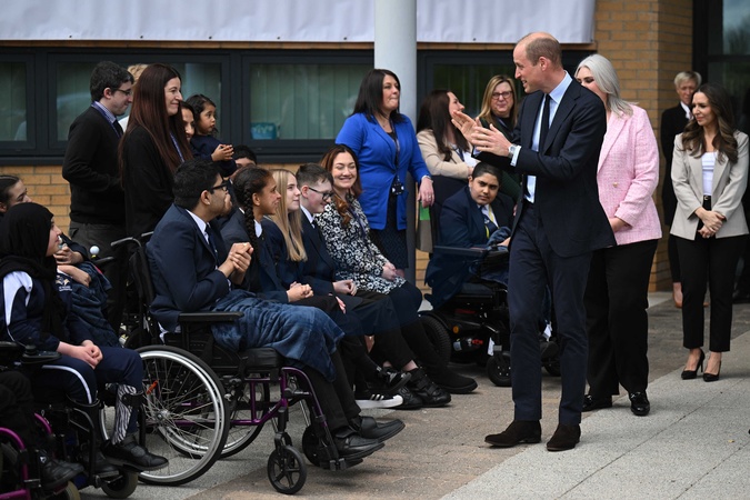 Britain's Prince William, Prince of Wales, speaks with schoolchildren as he leaves, after his visit to St. Michael's Church of England High School in Rowley Regis, central England on April 25, 2024. During his visit Britain's Prince William, Prince of Wales will learn about the award-winning student-led initiatives available to pupils to support their mental health and wellbeing., Credit:OLI SCARFF / Avalon