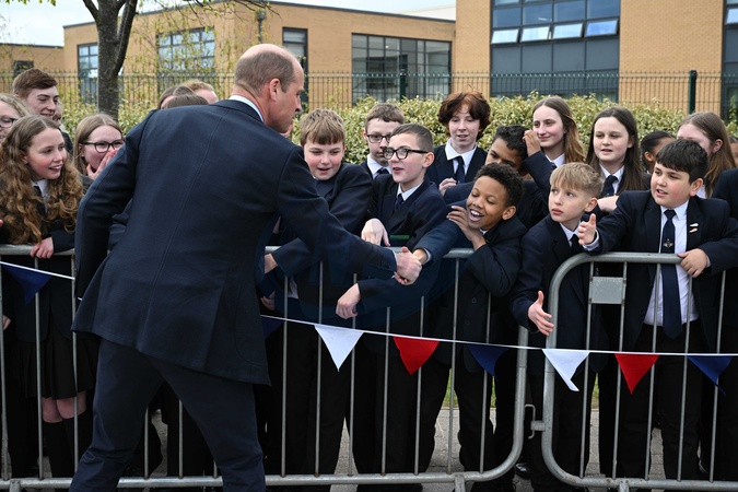 Britain's Prince William, Prince of Wales, speaks with schoolchildren after his visit to St. Michael's Church of England High School in Rowley Regis, central England on April 25, 2024. During his visit Britain's Prince William, Prince of Wales will learn about the award-winning student-led initiatives available to pupils to support their mental health and wellbeing., Credit:OLI SCARFF / Avalon