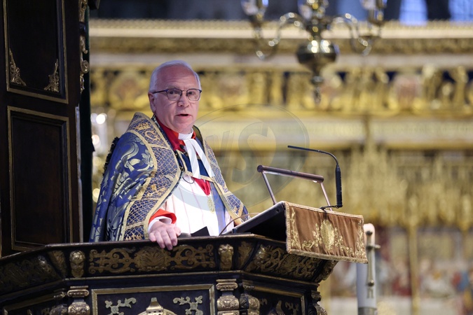 Dean of Westminster, priest David Hoyle, speaks at a commemoration service on Anzac Day at Westminster Abbey, London, Britain April 25, 2024., Credit:Belinda Jiao / Avalon