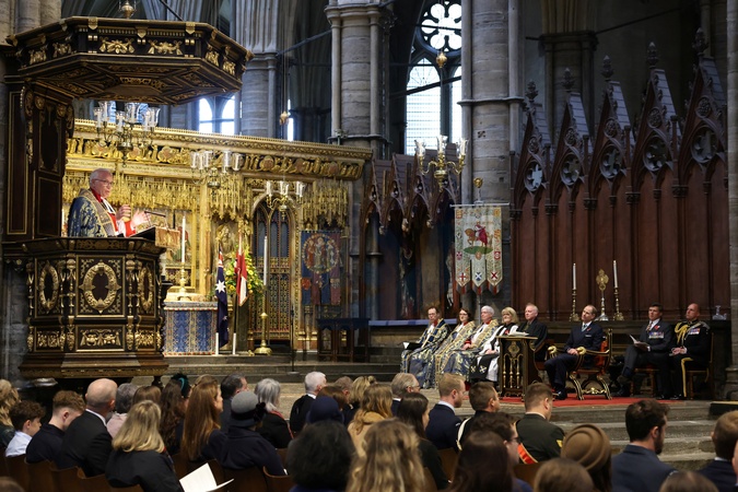 Dean of Westminster, priest David Hoyle, speaks at a commemoration service on Anzac Day at Westminster Abbey, London, Britain April 25, 2024., Credit:Belinda Jiao / Avalon