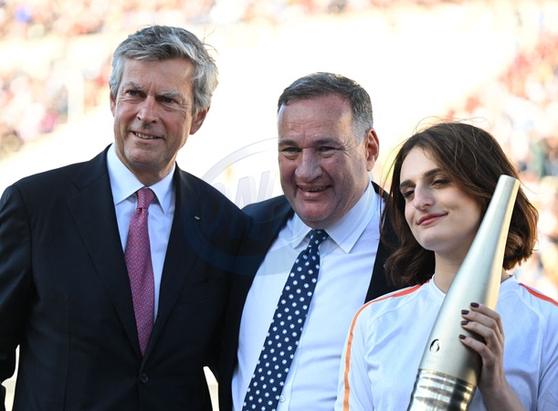 Guest, Spyros Capralos (président de Comité olympique hellénique) et Gabriella Papadakis (championne olympique de patinage) - Passation de la flamme olympique de la Grèce à la France austade panathénaïque d'Athènes, Grèce, le 26 avril 2024. © Nikos Zagas/Bestimage Passing of the Olympic flame from Greece to France at the Panathenaic Stadium in Athens, Greece, on April 26, 2024.